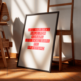 Plakat med teksten 'Jeg har ikke brug for terapi, jeg skal bare til København V'.